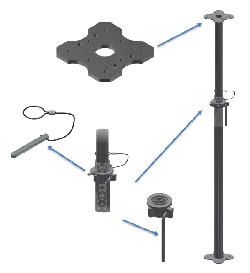 Combined with stripping Handle, the Nut has 3 Additional Ears for use with hammers to ease in stripping the shore while under load. Pins are of high grade steel, and come with attached safety cable to prevent loss of pins during transportation or on site handling.