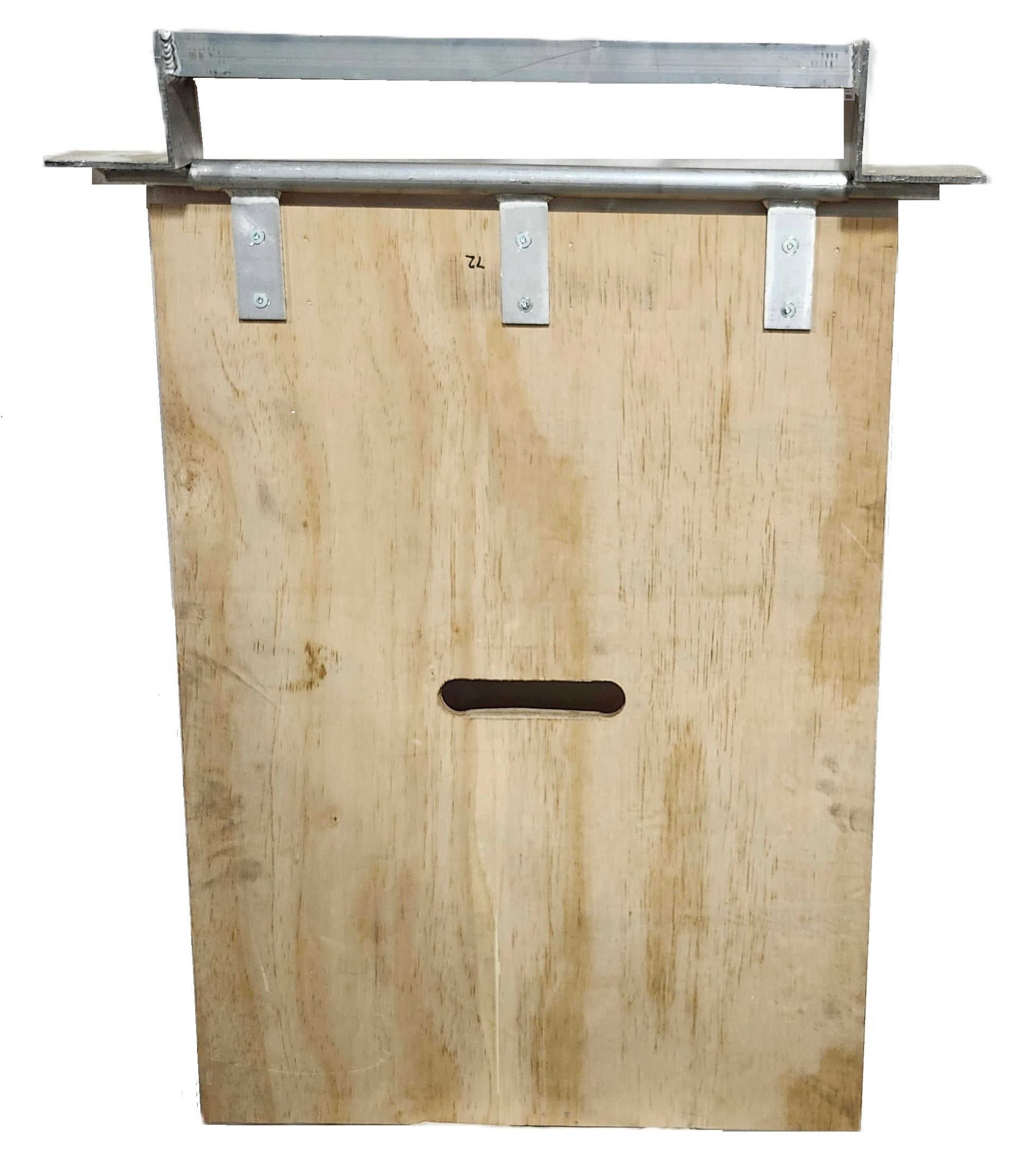 Plywood hatch with steel frame for aluminum ladder used in conjunction with scaffold planks. The steel frame rests onto the existing scaffold planks and the plywood hatch rests on the aluminum ladder.